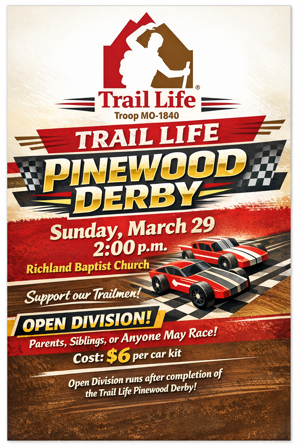 Join us for our Trail Life Pinewood Derby on Sunday, March 29 at 2:00 p.m.